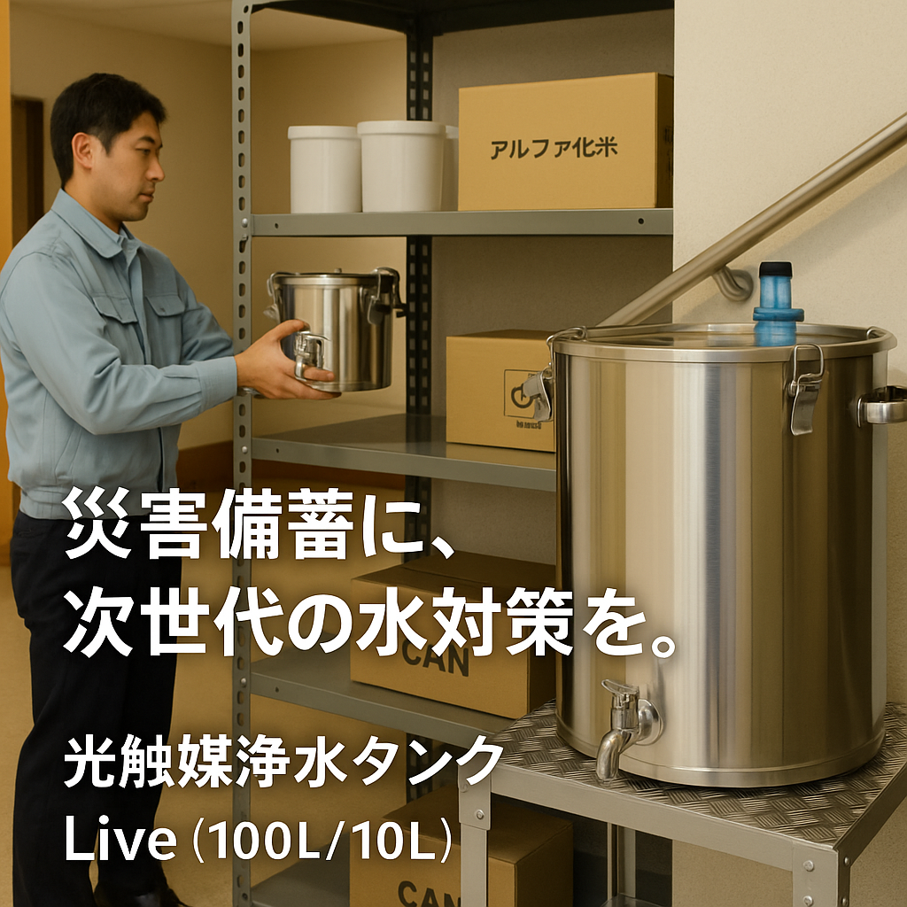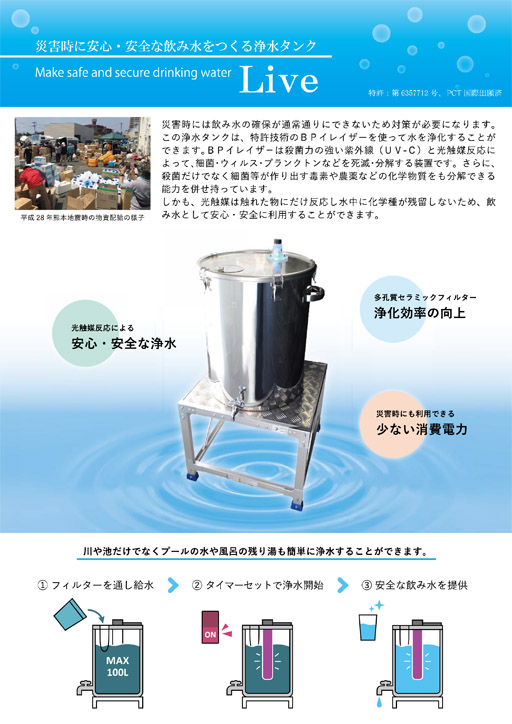 もし水道がストップするような大災害が発生した際、風呂の水、プールの水、川の水などの身近な水を直接浄化し、飲用可能な水をつくることが出来る光触媒浄水装置を開発しました。水を殺菌するだけでなく、農薬等の化学物質も分解できます。