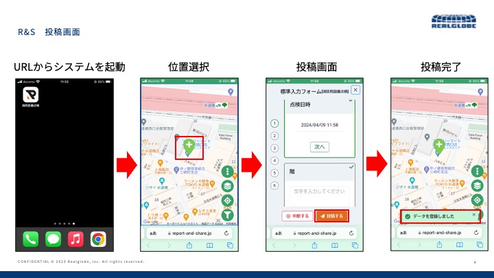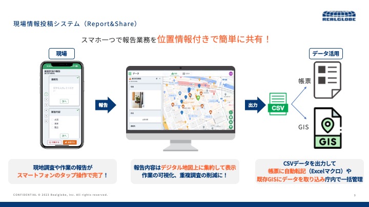 遠隔情報共有システム「Report&Share」は、スマートフォン一つで現場の被災状況を位置情報・写真付きで即座に共有・集約できるクラウドサービスです。