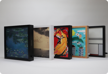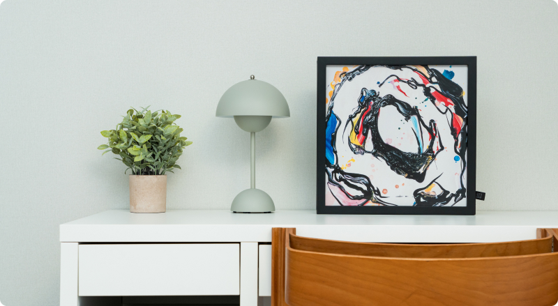 木製の重厚感あるフレームから、薄型のスリムモデルまで幅広く対応。アートも多彩な表情を持つ作品を取り揃えており、ご家庭やオフィス、ホテルなど空間に合わせたコーディネートが可能です。